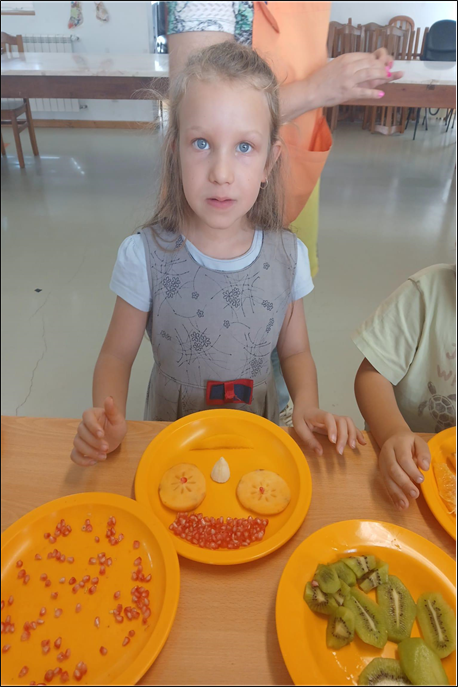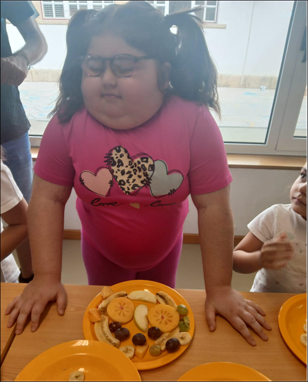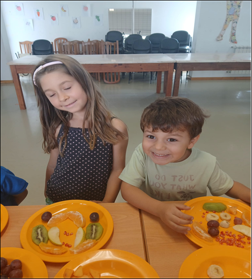 As crianças construíram arte com as frutas que trouxeram de casa. No final do almoço, degustaram a arte elaborada.